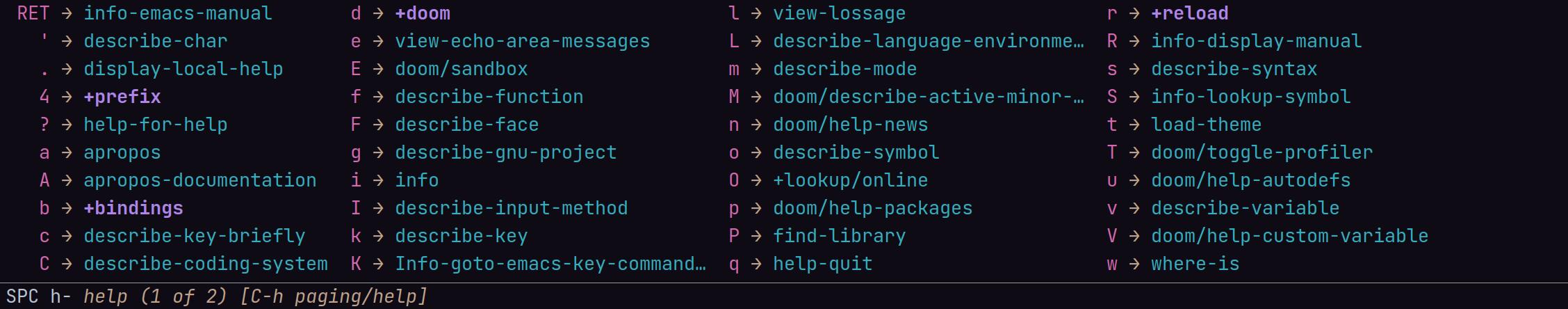 Well, there are handy commands for learning more about the functions we’re using on top of discovering new ones. Type SPC h and wait for a moment to view the available help commands and their corresponding keybinds.